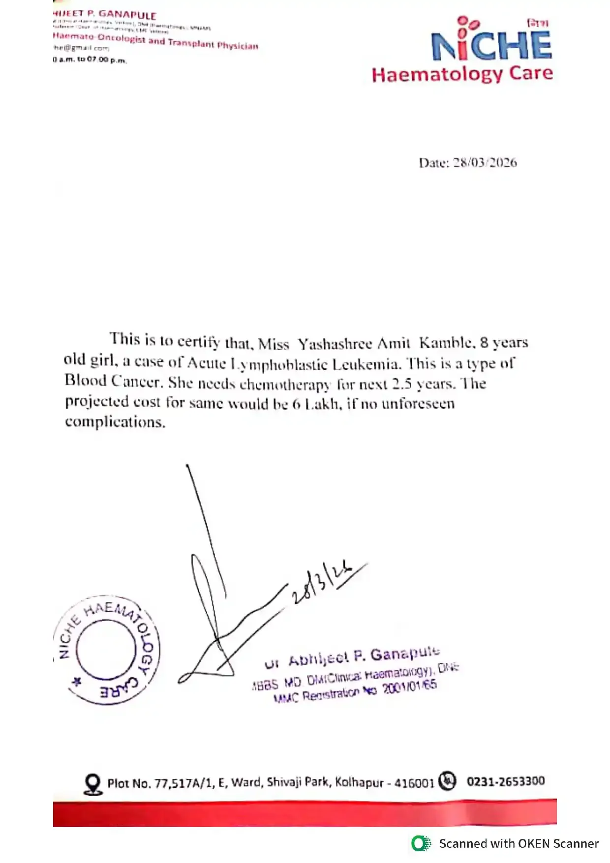 8-year-old Yashashree Kamble has been diagnosed with Acute Lymphoblastic Leukemia (ALL), a serious form of blood cancer. She urgently requires immediate medical treatment and supportive care.